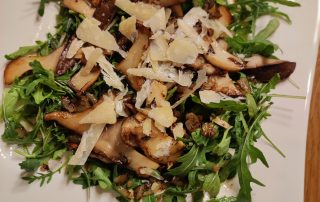Rucola waschen, etwas trocken schleudern und auf dem Teller anrichten. Öl in einer Pfanne erhitzen und die in Scheiben geschnittenen Kräuterseitlinge kräftig darin anbraten. Zwiebelwürfel und Knoblauch mitrösten und 1 EL Butter hinzufügen und weiterrösten. Dann das Dressing aus 1 EL Weißweinessig, ½ EL Ahornsirup, 1 EL Olivenöl, Kräutersalz und Pfeffer kräftig vermischen. Zum Schluss die Kräuterseitlinge auf dem Rucola anrichten, das Dressing darauf träufeln und mit Parmesan anrichten. Dazu kann man ein Baguette servieren.
